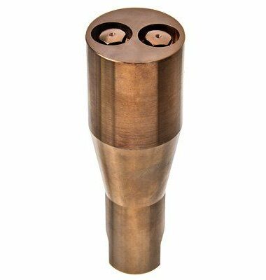 2-Jet nozzle carrier designed for use in surface cleaning and as a nozzle carrier on air rotational tools. Made of hardened stainless steel with recessed nozzle ports, the carrier is 1-1/8"dia and 4" long. Features a 9/16-18 inlet port available in cone or button style and accepts 3/8-24 nozzles. Made