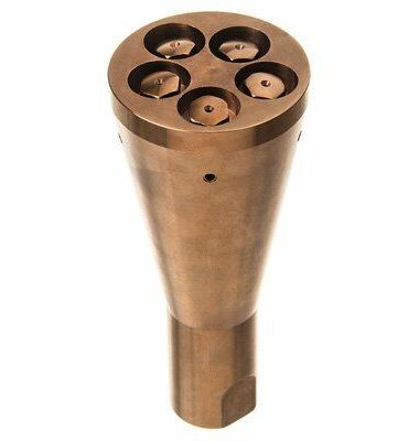 5-Jet nozzle carrier designed for use in surface cleaning and as a nozzle carrier on air rotational tools. Made of hardened stainless steel with recessed nozzle ports, the carrier is 1-7/8"dia and 4" long. Features a 9/16-18 inlet port available in cone or button style and accepts 3/8-24 nozzles. Made